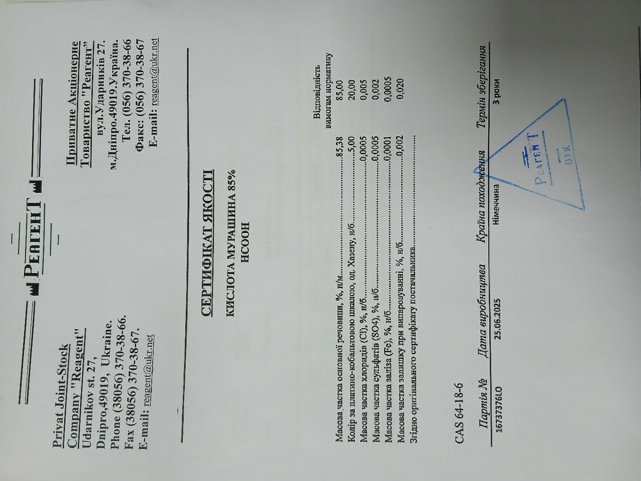 | Виробник | ПрАТ "Реагент" м. Дніпро |