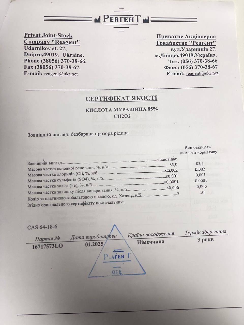 | Виробник | ПрАТ "Реагент" м. Дніпро |